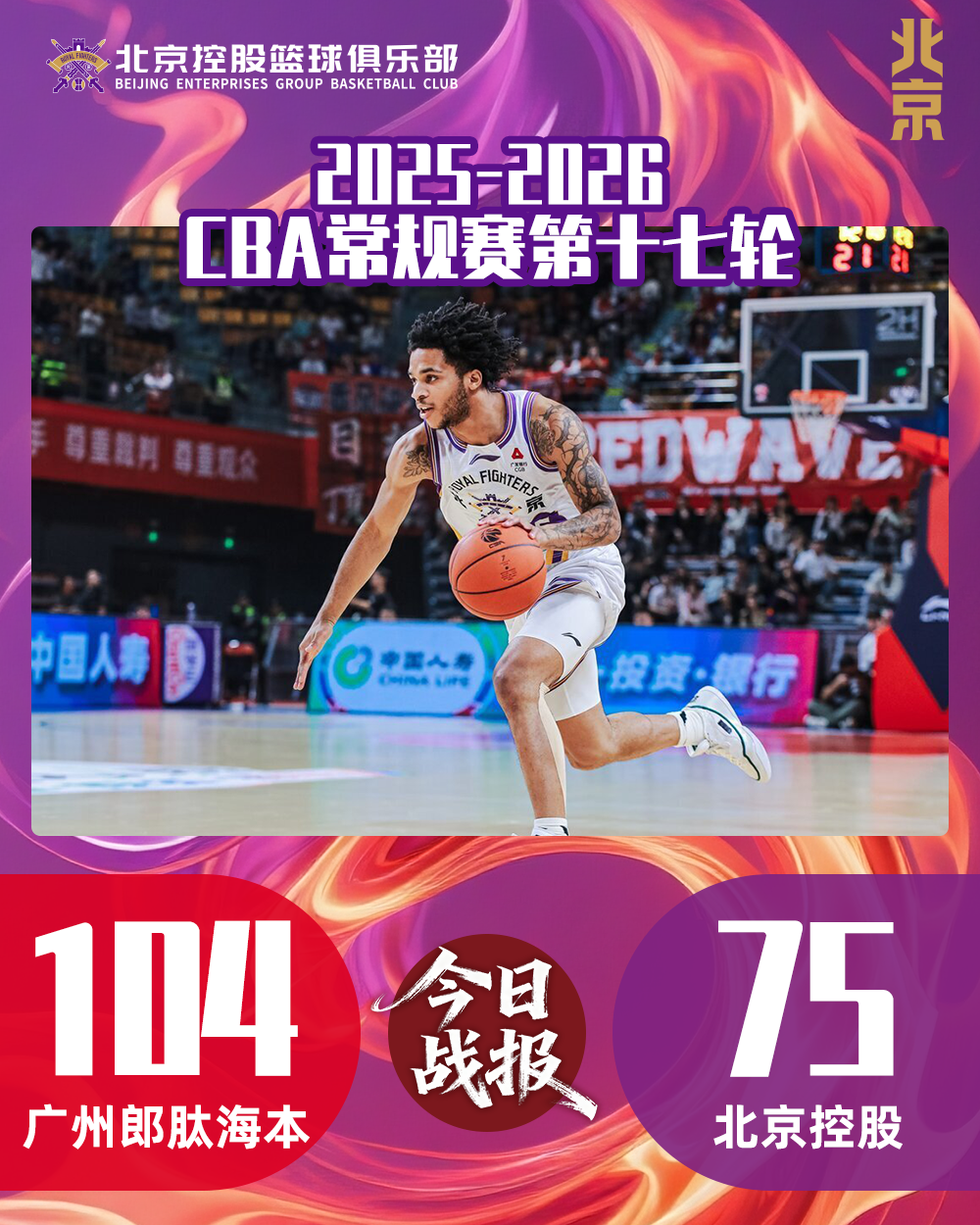 1月19日晚,北控男篮迎来广东之行的第二场比赛,对阵广州朗肽海本。本场比赛,全队始终无法找到上一场战胜广东队时的节奏与感觉,进攻端手感不佳、防守成功率偏低、全场16次失误……最终以75:104不敌对手,结束客场之旅。